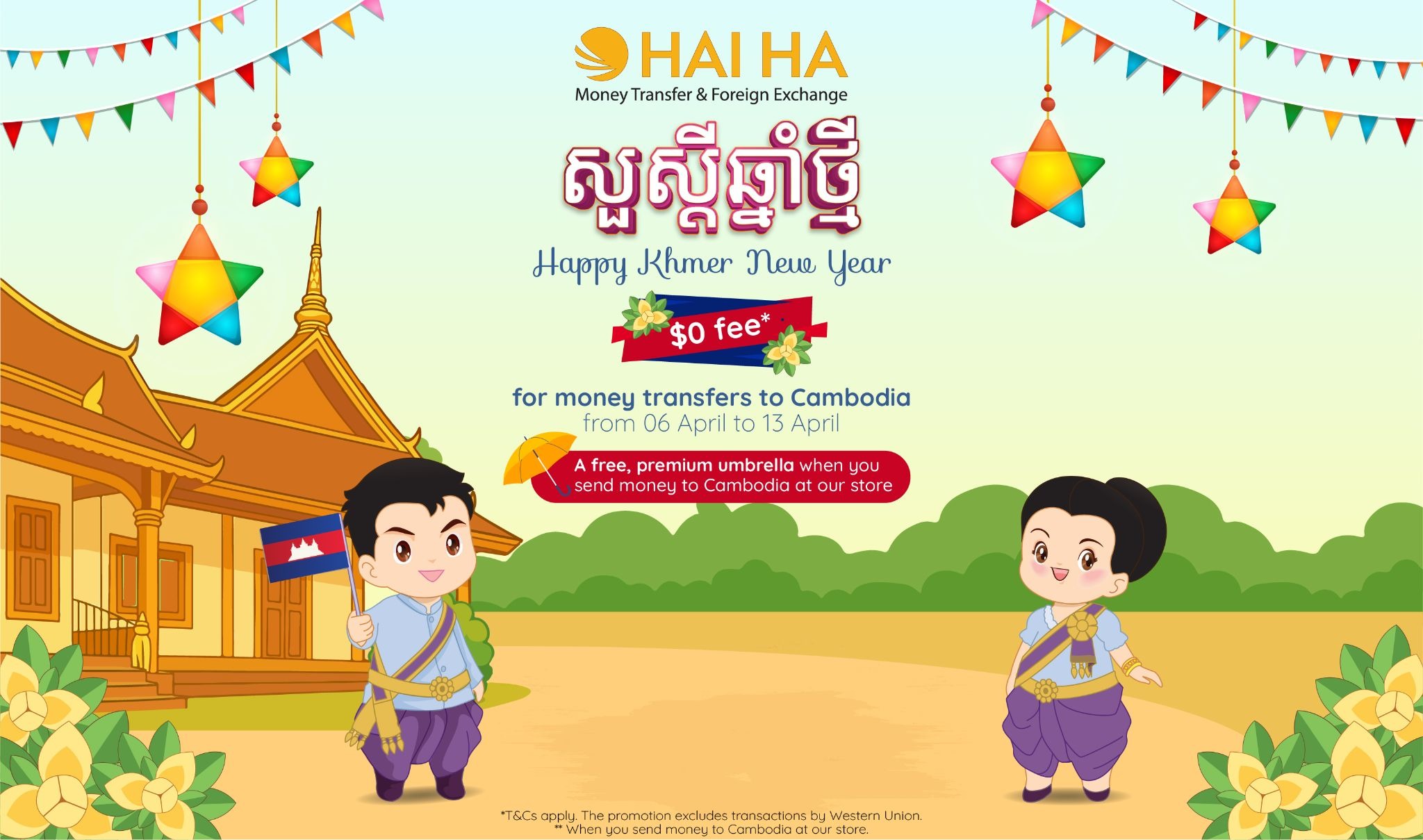 Đừng bỏ lỡ cơ hội gửi tiền về cho gia đình trong dịp Choul Chnam Thmey với ưu đãi $0 phí cùng những phần quà hấp dẫn từ Hải Hà nhé!